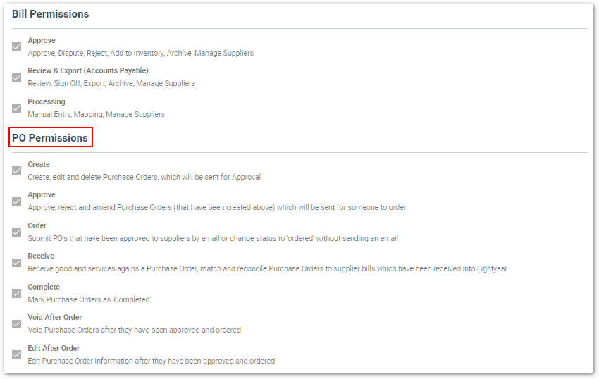 Users can now have Purchase order permission without approval permission attached automatically. When setting a user with permissions, you can now choose between Bill permissions, PO permissions or both.