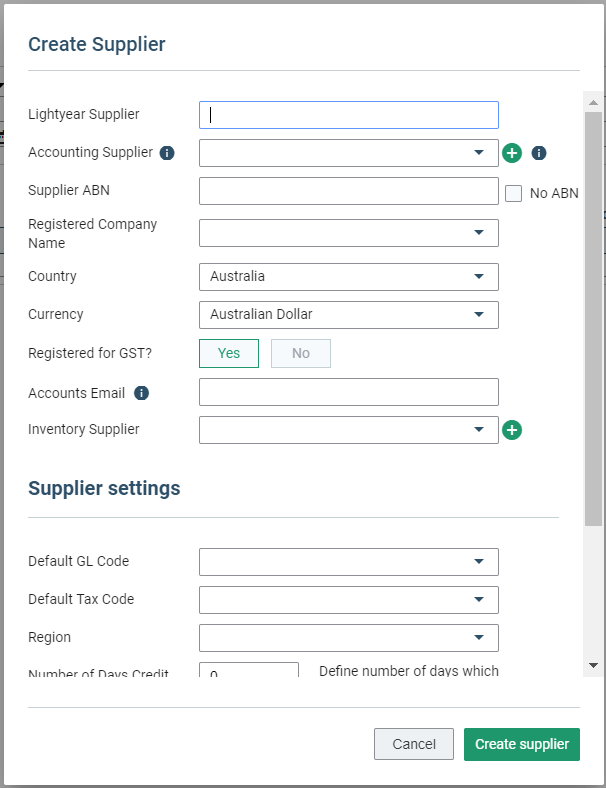 If this is a new supplier, I can create it here and set its defaults by clicking the small green plus button.