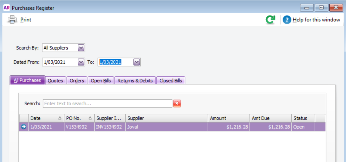 Once you've exported your bills from Lightyear into MYOB, head over to your Purchases > Purchases Register to bring up the list of bill records.