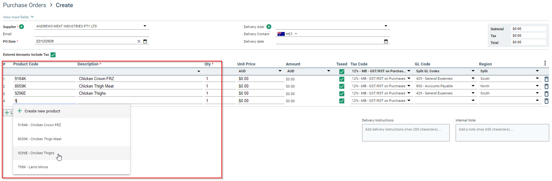 Now, when you select "Create PO" you can click on the product box and either begin to type the product code, or select from the drop down menu that appears for you.