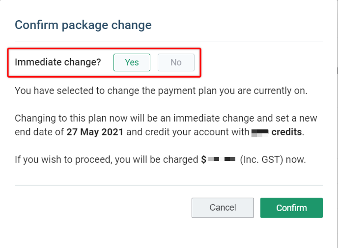 Select whether you'd like the new plan to take effect immediately, or to begin at your next billing date, and press Confirm