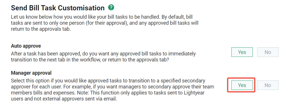 Note: If Manager Approval is enabled, any user that receives a Bill Task must have a manager assigned to them.
