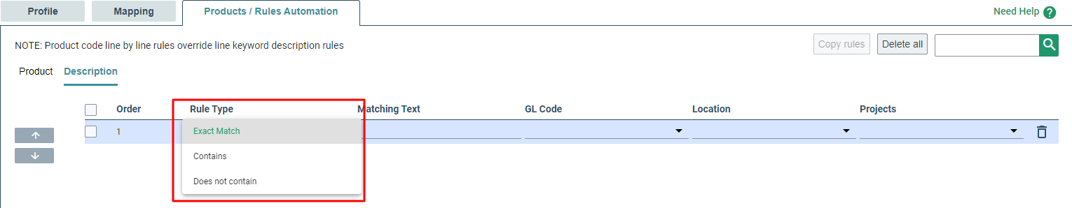 When creating a rule, each description can be matched as 'Exact', 'Contains' or 'Does Not Contain'. To change this, in the Rule Type Column, you can select one of these options from the dropdown menu. These rules will ignore capitalisation and spaces.