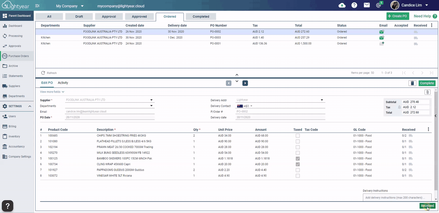 Lightyear POs will help you 2 way match your POs against your goods/services received at a line item level. This will be a massive time saver to help you accurately check against the goods delivered so you can confidently close out and complete your POs.