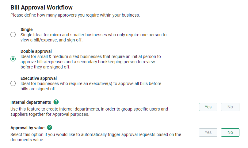 The Sign-off Type allows you to customise your account's approvals setup of your documents i.e your bills, credit notes and receipts. You can select from these 3 options: