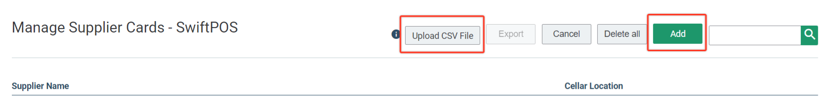 Supplier Cards can be manually entered by selecting "Add", or for larger lists, a csv file can be uploaded. This file can contain either simply the Supplier name, or the Supplier name and it's Cellar Location (if required).